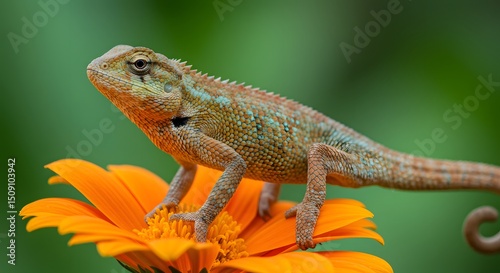 © Khawar, Obraz premium Colorful Chameleon Orange Flower Macro Photography
