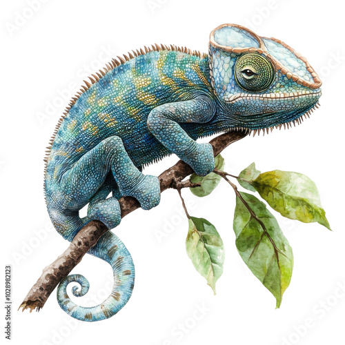 Obraz premium Colorful chameleon perched on a branch with green leaves, white isolated background.