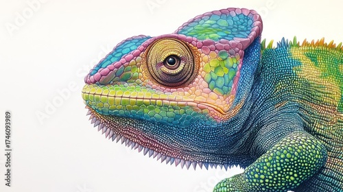 © Imam Soleh, Fototapeta premium Colorful chameleon portrait, studio shot, white background, adaptation