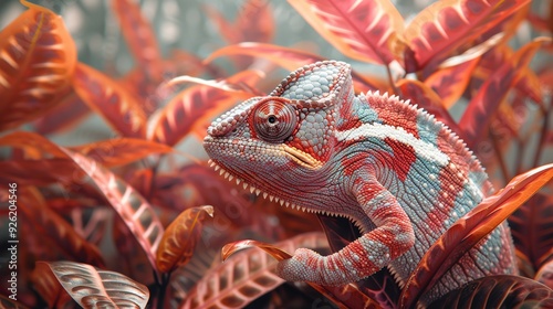 Obraz premium Colorful chameleon resting among vibrant red and orange foliage in a lush...