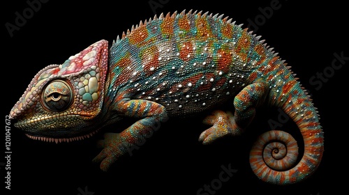 Obraz premium Colorful chameleon studio shot, vibrant scales, black background, exotic pet