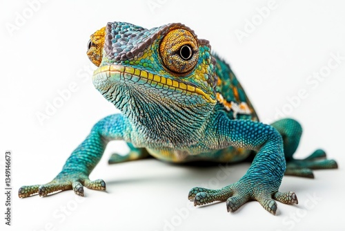 © BWS Stock, Fototapeta premium Colorful Chameleon Walking Isolated on White Background Close-up Wildlife Animal