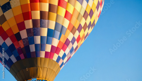 © abu, Obraz premium Colorful checkered hot air balloon ready for flight against blue sky