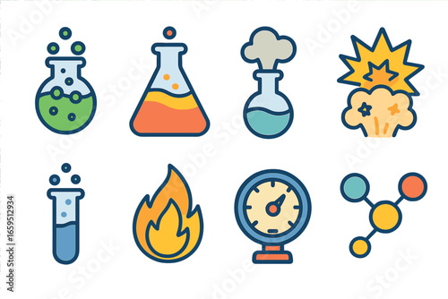 © Viacheslav, Fototapeta premium Colorful Chemistry Icons. Flat vector mini-illustrations chemical reactions in colors children's illustrations: bubbling liquid,