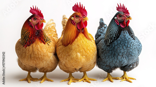 Fototapeta premium Colorful chickens standing together, showcasing their unique feathers and...