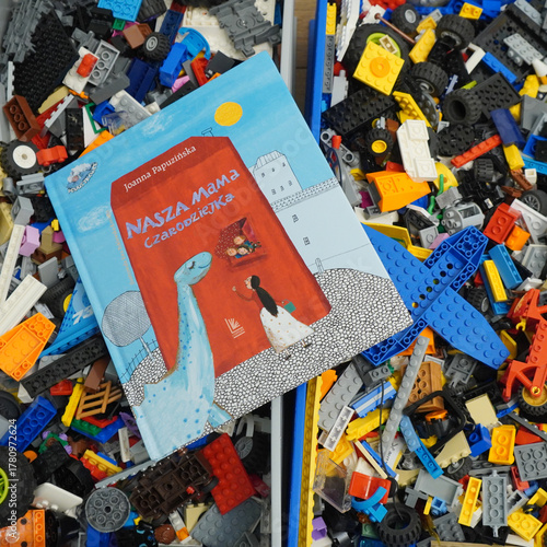 © Everyday Frame, Fototapeta premium Colorful children's book on a pile of toy building blocks