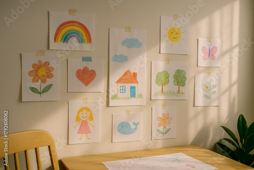 © thodonal, Obraz premium Colorful children's drawings displayed on wall in cozy room