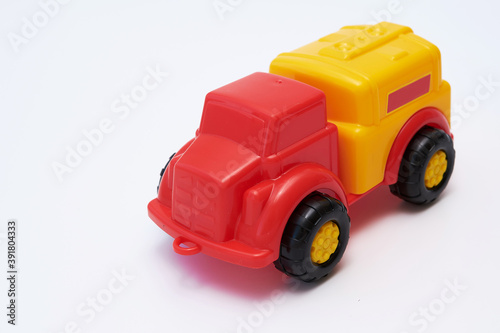 Obraz premium Colorful Children's toy car truck with a red cab and a yellow plastic body on...