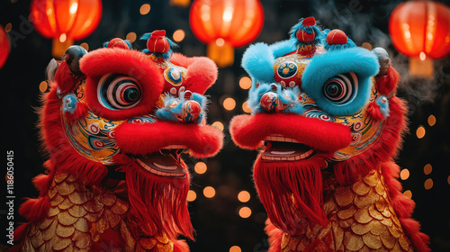© O, Naklejka premium Colorful chinese dragon costumes amidst festive lanterns and lights. Chinese New Year