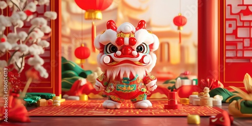 Naklejka premium Colorful chinese new year dragon figurine surrounded by festive red decor