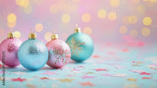 Fototapeta premium Colorful Christmas baubles with glittery designs on a pastel background,...