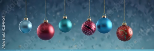 © Prayad, Fototapeta premium Colorful Christmas ornament elements suspended in mid-air on a serene blue background, blue, holiday, hanger