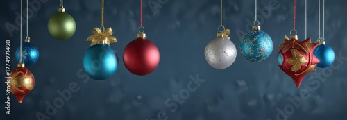 Fototapeta premium Colorful Christmas ornaments hanging from a blue background, hanger,...