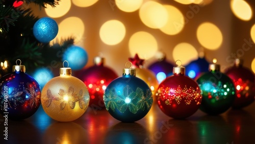 Fototapeta premium Colorful Christmas ornaments hanging on a festive tree, illuminated by soft bokeh lights, creating a warm holiday atmosphere perfect for seasonal celebrations
