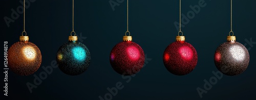 Fototapeta premium Colorful Christmas Ornaments Hanging on Strings with Sparkling Glitter Effect on Dark Background