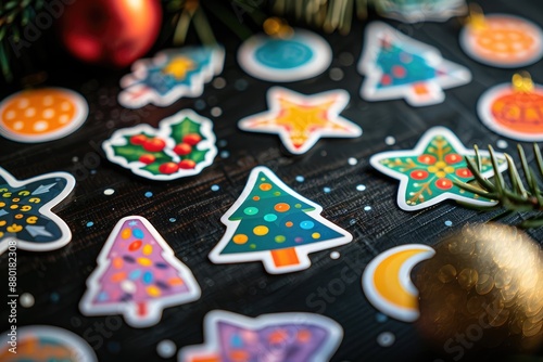 © kardaska, Fototapeta premium Colorful Christmas-themed stickers on a dark background