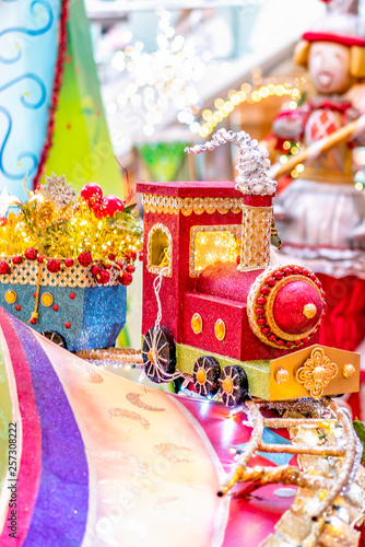 Fototapeta premium Colorful Christmas train decoration with lights background
