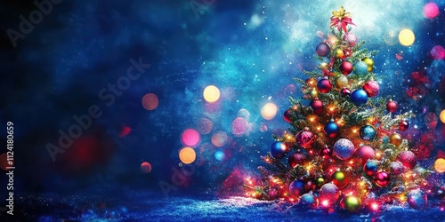 © Nice Seven, Naklejka premium Colorful Christmas Tree with Bright Decorations Set Against a Blue Background, Capturing the Essence of Holiday Cheer and Festive Spirit