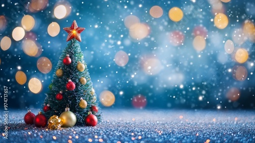© Daria, Obraz premium Colorful christmas tree with decorations on blue bokeh background for festive banner design