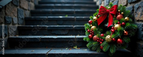 © Pusit, Fototapeta premium Colorful Christmas wreath on dark stone staircase, holiday, christmas