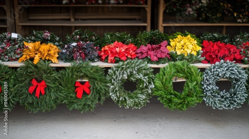 © Seyyar, Fototapeta premium Colorful Christmas wreaths displayed at a traditional market showcasing festive Advent decorations on a winter day.
