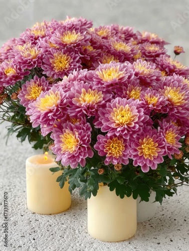 Fototapeta premium Colorful chrysanthemums and candles create a warm and inviting atmosphere for...