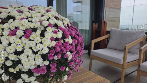 Obraz premium Colorful chrysanthemums on a modern balcony for relaxed outdoor living