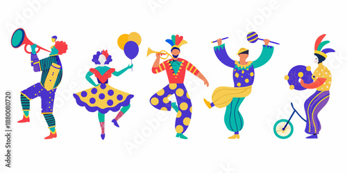 © Mityunjoy, Obraz premium Colorful circus performers playing instruments and juggling with vibrant costumes