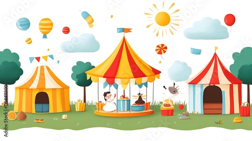 Naklejka premium Colorful circus scene with carousel, tents, and animals.