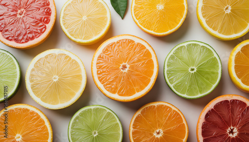 Obraz premium Colorful citrus fruit slices arranged on a light background