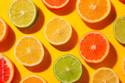 Fototapeta premium Colorful citrus fruits arranged on a bright yellow background for a vibrant...
