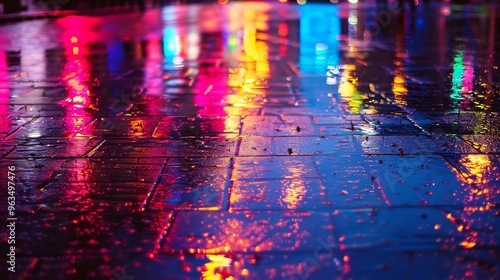 Obraz premium Colorful City Lights Reflected in Wet Pavement