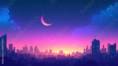© vuang, Fototapeta premium Colorful city skyline at twilight with crescent moon