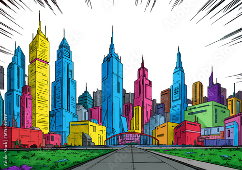 Fototapeta premium Colorful City Skyline Illustration With Buildings And Dark Night Background