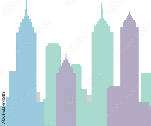 © OKAN, Fototapeta premium Colorful city skyline silhouette vector with pastel blue green and purple buildings in simple style for urban design and architecture projects