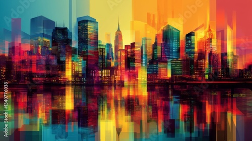 © free, Obraz premium Colorful city skyline with reflection creates an urban abstract