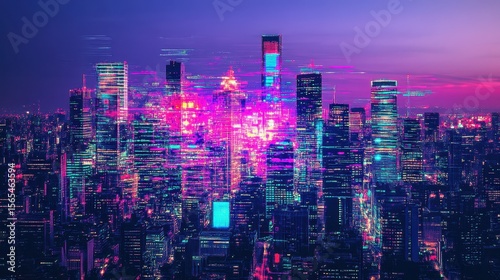 © AnggaNur, Obraz premium Colorful cityscape at night with digital overlays.