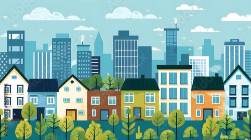 Obraz premium Colorful Cityscape Illustration with Buildings and Trees