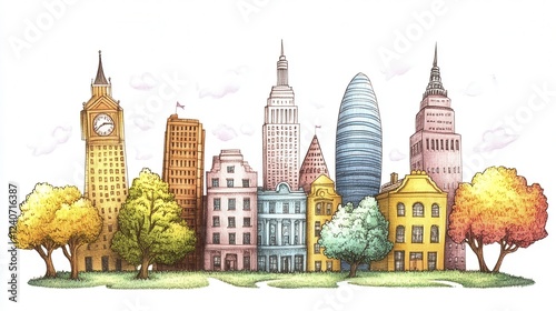 © UnElle , Obraz premium Colorful Cityscape Illustration with Clock Tower and Skyscrapers