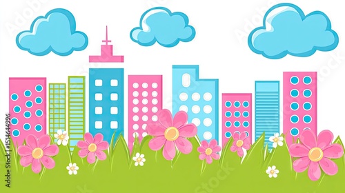Fototapeta premium Colorful cityscape with flowers and clouds.