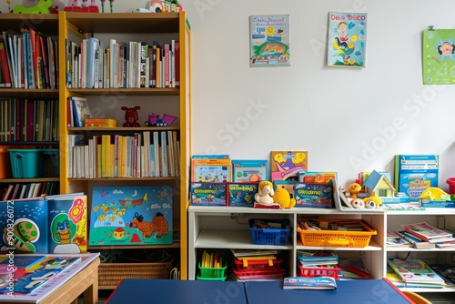 Naklejka premium Colorful Classroom with Bookshelves and Toys