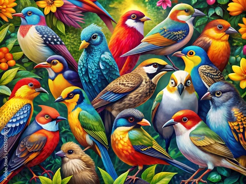 Obraz premium Colorful Clip Art of Various Bird Species in a Vibrant Artistic Style for...