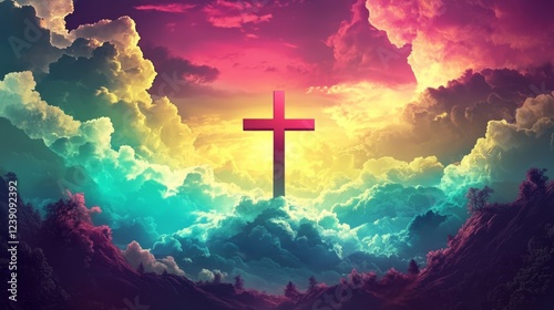 © Zaiseefa, Obraz premium Colorful clouds enveloping a central Christian cross image.