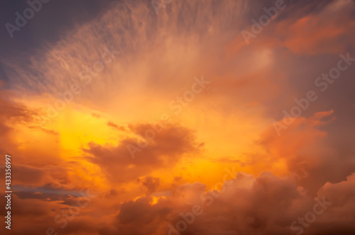 Naklejka premium Colorful clouds formation like a wave in yellow to pink gradation tones, illuminated by a magic sunlight. Cumulonimbus and cirrus.