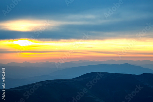 Fototapeta premium Colorful clouds in the sky at sunset against the backdrop of a mountainous...