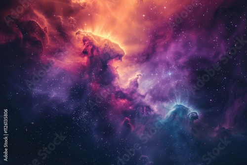 Fototapeta premium Colorful clouds of gas and dust swirl together, illuminated by the light of distant stars, creating a mesmerizing nebula that showcases the beauty of space.
