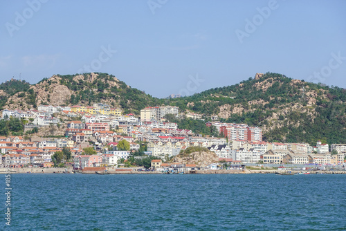 Obraz premium Colorful Coastal Town Across Calm Blue Sea