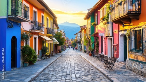 © Boonnam Burart, Fototapeta premium Colorful Cobblestone Street in a Vibrant Village at Sunset