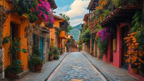 © afif, Fototapeta premium Colorful cobblestone street, vibrant buildings, mountain backdrop, flowers, ideal for travel, tourism, or hospitality