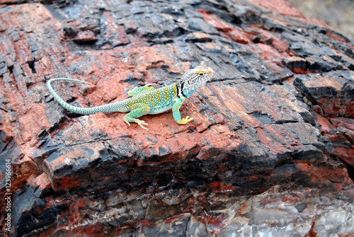 © mhgstan, Naklejka premium colorful collared lizard on petrified wood in Petrified Forest National Park